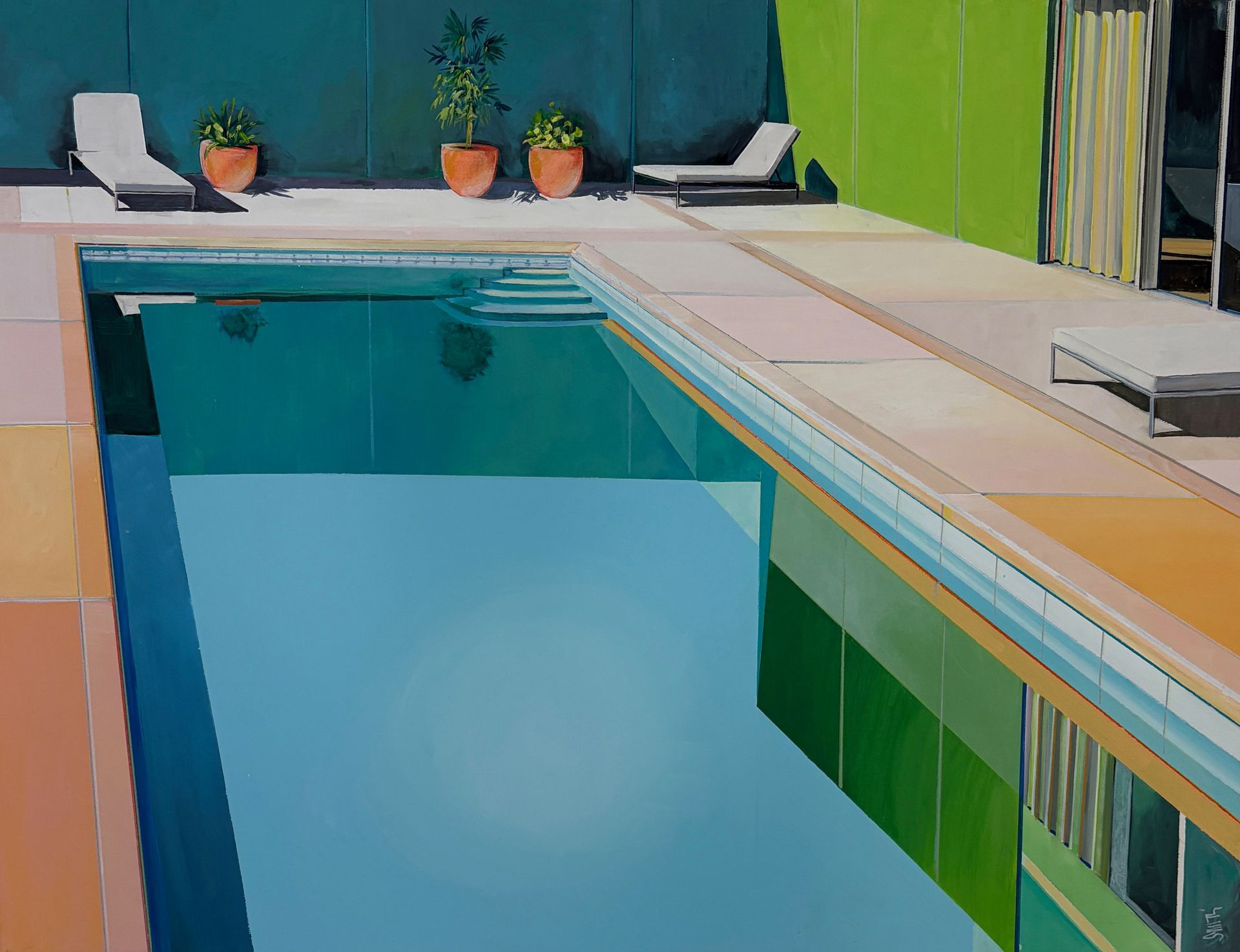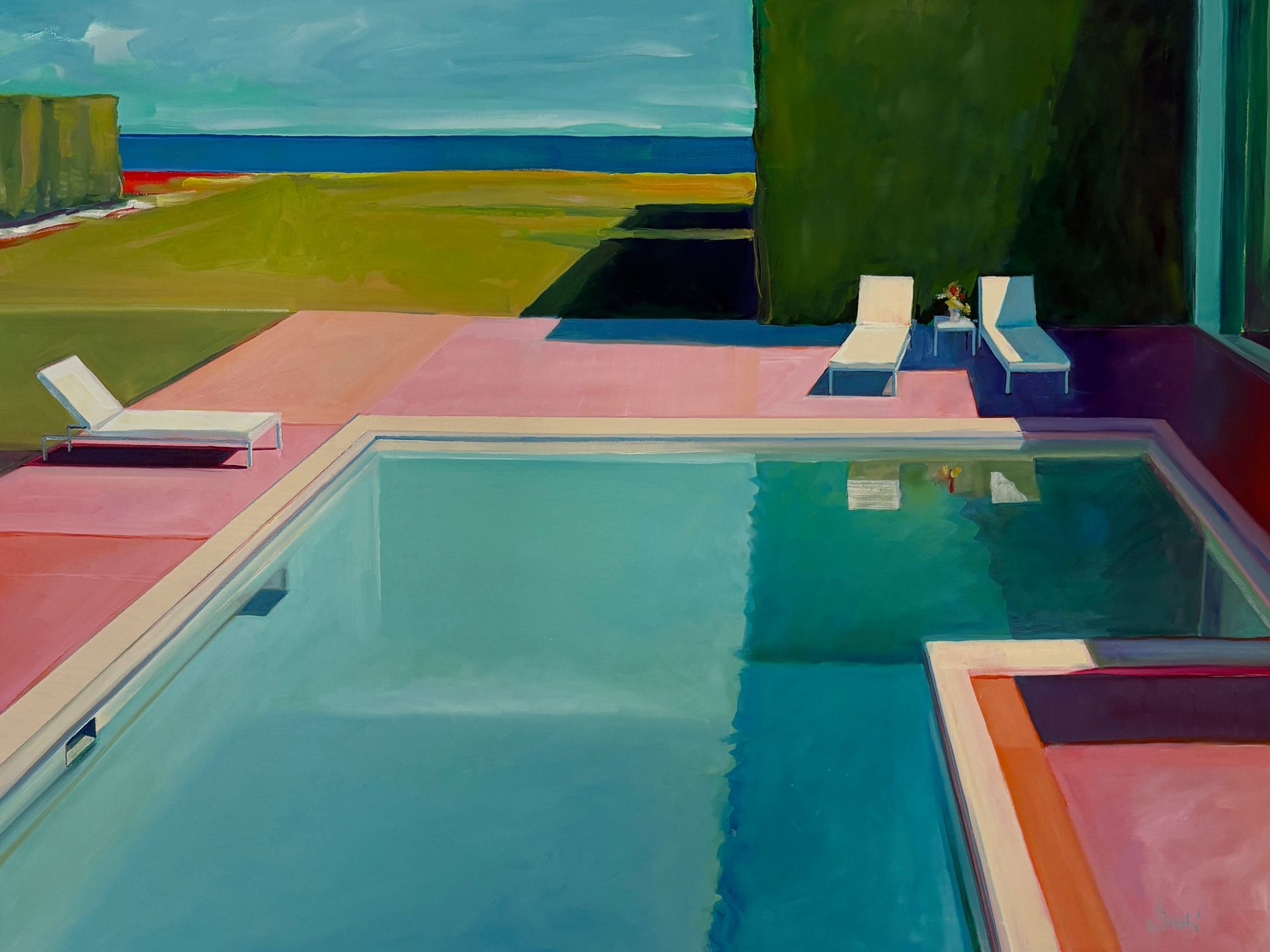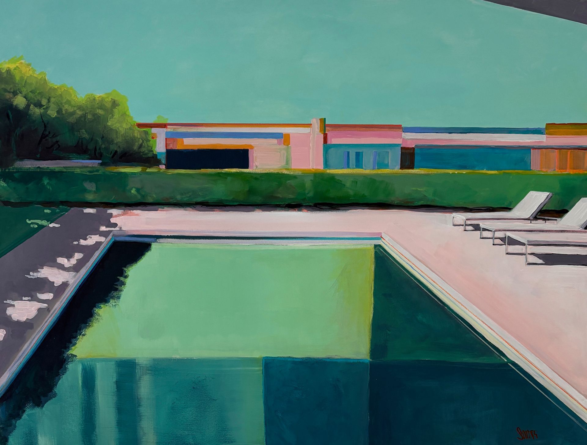 His work is characterized by its vibrant colors, dynamic compositions, and an exploration of light and shadow. His paintings often feature scenes of leisure and tranquility, reflecting his deep connection to the landscapes of his childhood. The “Endless Summer” series, one of his most celebrated collections, captures the essence of summer days spent in swimming pools and neighborhood yards that evoke nostalgia and a sense of carefree joy. In these paintings, Smith’s use of bold, contrasting colors and meticulous attention to detail create a sense of warmth and intimacy. His depiction of light and shadow not only adds depth to his work but also infuses it with a sense of time and memory. The series serves as a tribute to the simple pleasures of summer and the enduring beauty of his hometown.