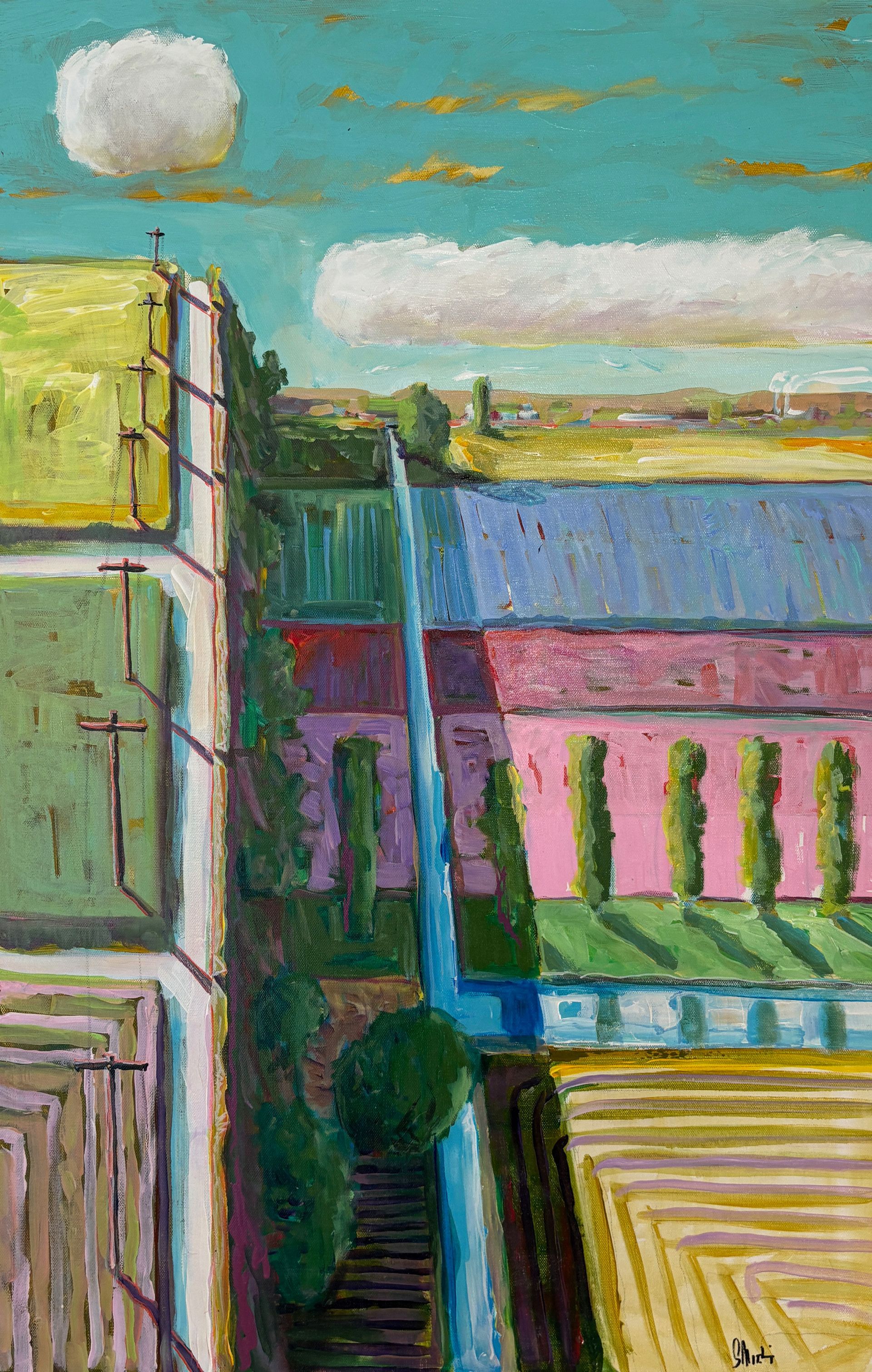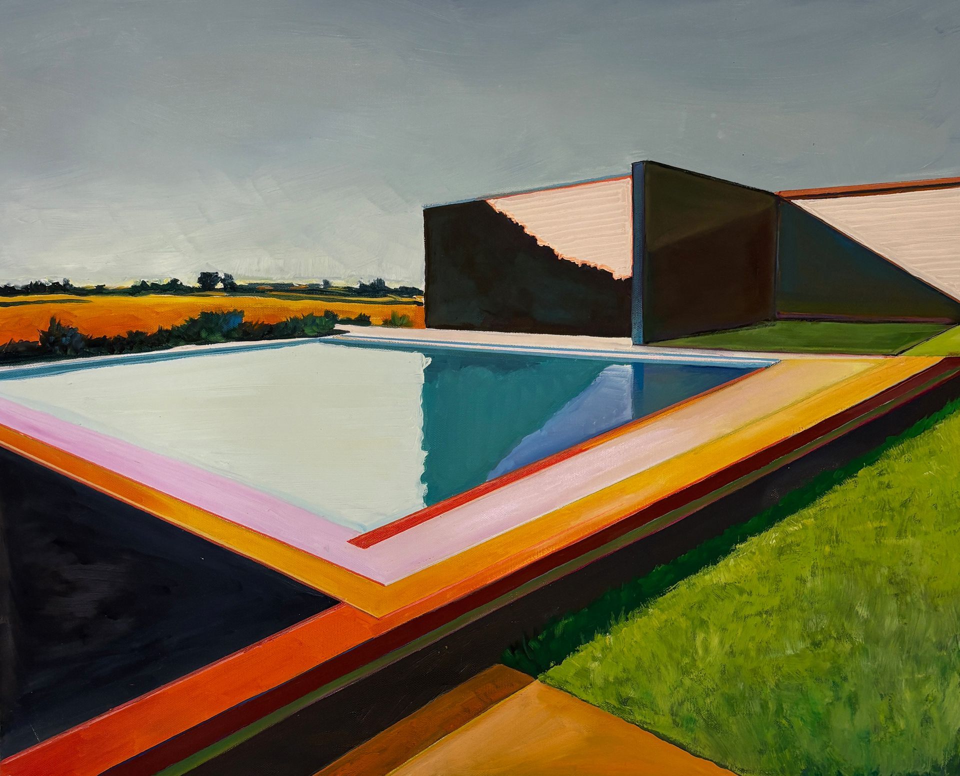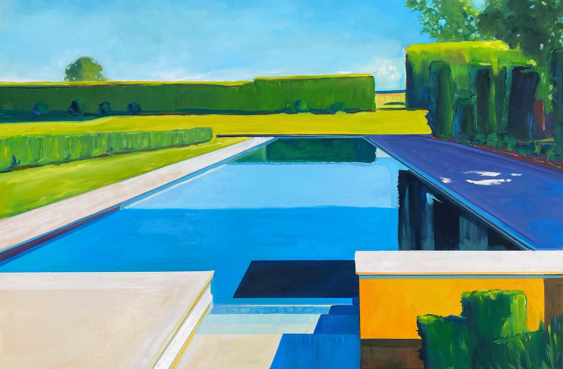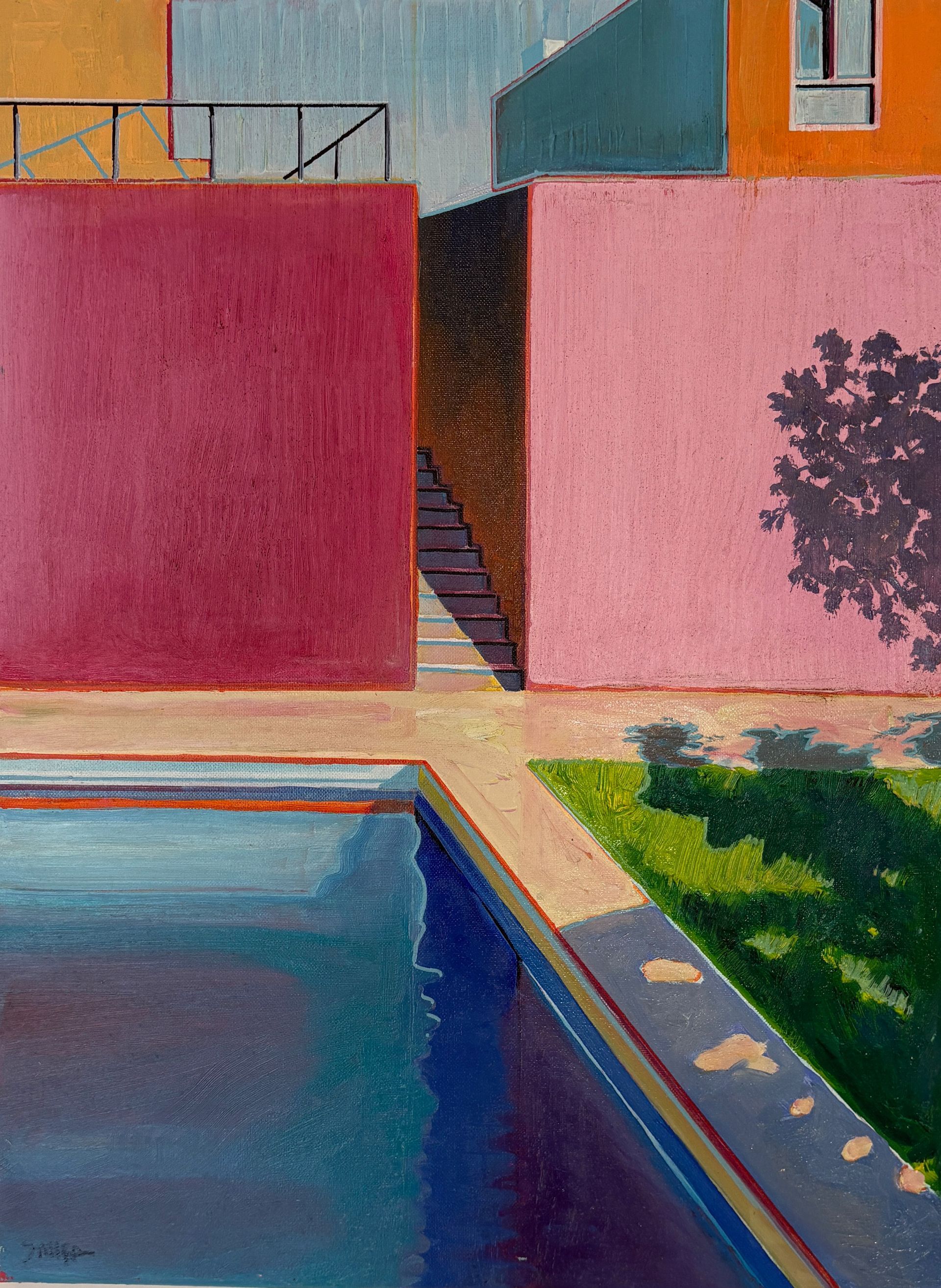 His work is characterized by its vibrant colors, dynamic compositions, and an exploration of light and shadow. His paintings often feature scenes of leisure and tranquility, reflecting his deep connection to the landscapes of his childhood. The “Endless Summer” series, one of his most celebrated collections, captures the essence of summer days spent in swimming pools and neighborhood yards that evoke nostalgia and a sense of carefree joy. In these paintings, Smith’s use of bold, contrasting colors and meticulous attention to detail create a sense of warmth and intimacy. His depiction of light and shadow not only adds depth to his work but also infuses it with a sense of time and memory. The series serves as a tribute to the simple pleasures of summer and the enduring beauty of his hometown.